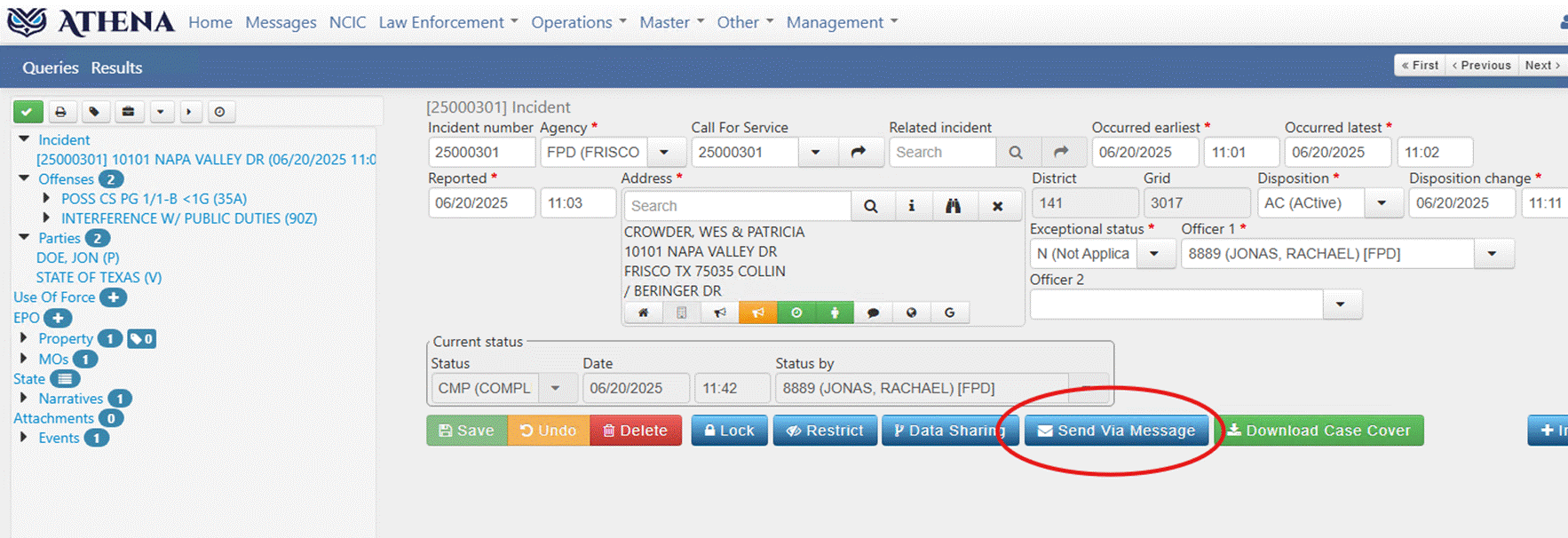 If you have back-up officers and they have added a supplemental report to the incident and it is found that they need to make corrections to it, the status event will not put the incident back on their scorecard for corrections. To notify those back-up officers of their reports needing correction, use the 'Send Via Message' button on the main incident page: