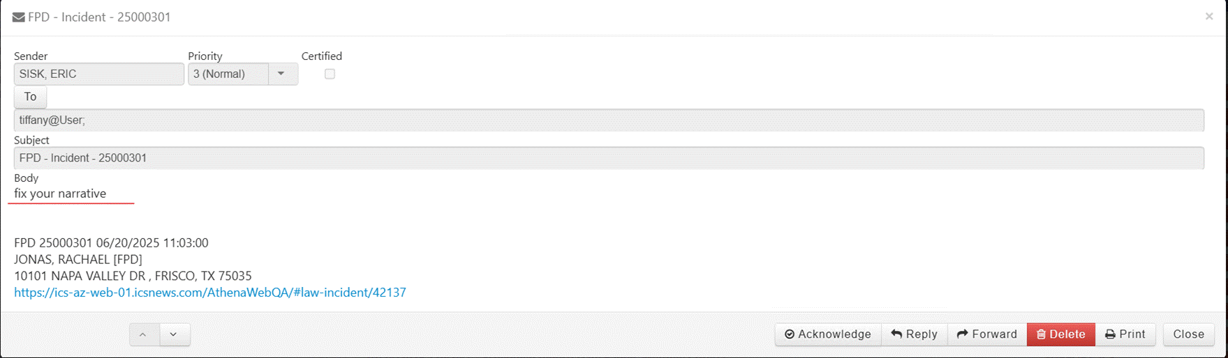 You can then choose the officer that wrote the supplement as the recipient and the message they'll receive is pre-populated with info on that incident. You can still type in the body of the message, letting them know their narrative needs correction, and this is what that user will see in their messages: